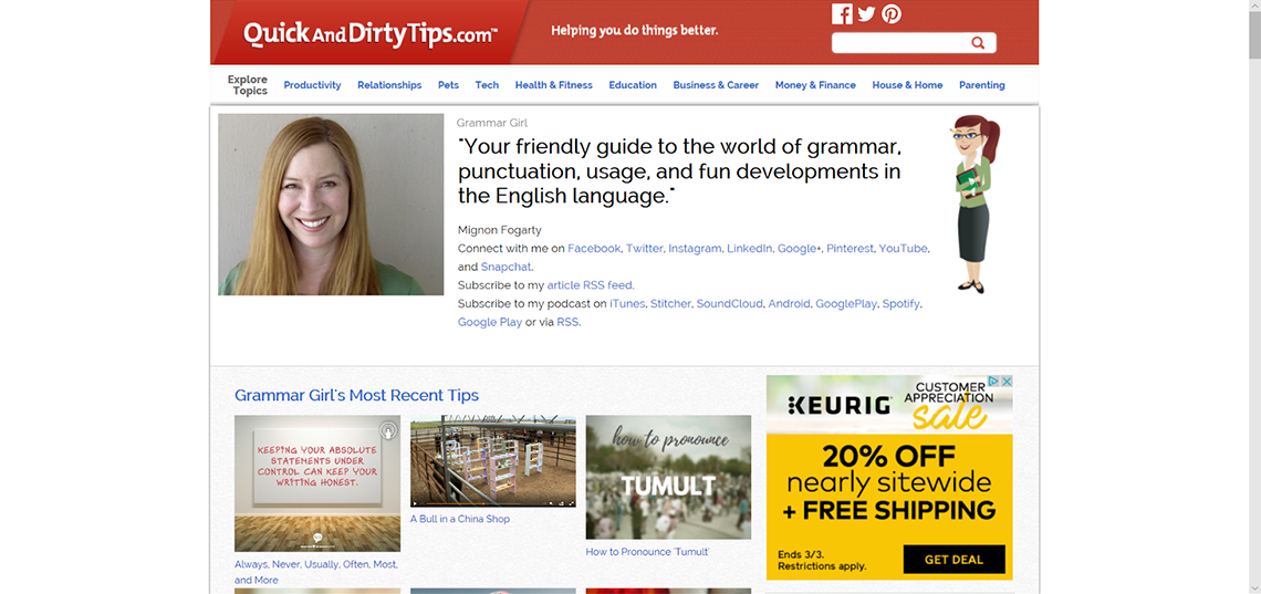 Founded by writer and teacher Mignon Fogerty (a.k.a. “Grammar Girl”), the Quick and Dirty Tips website features a series of podcasts and blog posts about different grammar topics. If you don’t have the time to sit at a computer and read a grammar lesson, the podcasts (available on iTunes and YouTube) are particularly helpful. Grammar Girl’s conversational tone is a pleasure to read and hear, and thus her lessons tend to be more memorable than some of the reference guides listed above. As with the Kaplan blog, you may have to do some searching if you are looking to learn a specific grammar rule or concept. If you prefer to have a physical book handy, you can also buy Mignon Fogerty’s Grammar Girl’s Quick and Dirty Tips for Better Writing.