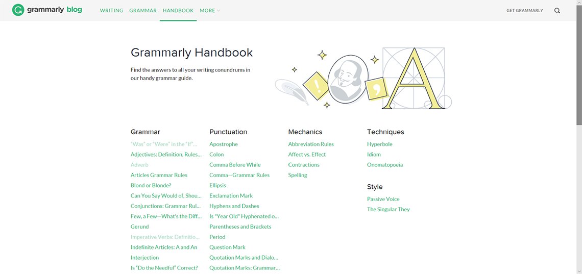 The Grammarly Handbook provides a series of brief guides to questions about grammar, mechanics, punctuation, and style. Like Purdue OWL and GrammarBook, Grammarly is targeted for all writers, not only for English language learners. The Grammarly Handbook is a comprehensive guide to the most common grammar questions and mistakes. What distinguishes Grammarly from other online resources is its use of charts to show verb conjugation and present grammatical concepts in a new visual way. Grammarly also has a particularly detailed section on punctuation, including rules for apostrophes, commas, hyphens and dashes, quotation marks. Even if you prefer one of the other online resource guides for day-to-day reference, you can sign up for Grammarly’s weekly email list of grammar tips and learn something new while riding the subway or drinking your coffee in the morning.