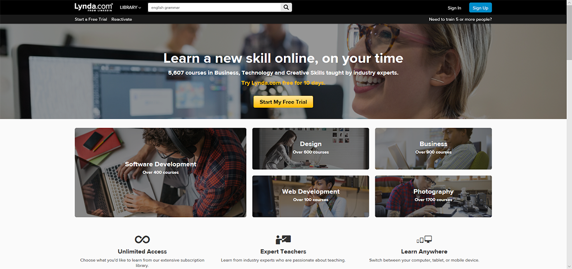 Tailored for business professionals, Lynda.com is an offshoot of LinkedIn that offers online professional development classes, including tutorials for English grammar. Lynda.com has a video format rather than a blog or guide and may be more helpful for visual learners. While Universal Class charges by the course, Lynda.com has a monthly subscription fee of $19.99 for the basic version and $29.99 for the premium version, giving you access to more than 5,000 online courses. You can also sign up for a 10-day free trial. If you intend to take multiple courses in a short period of time, Lynda may be the better option.