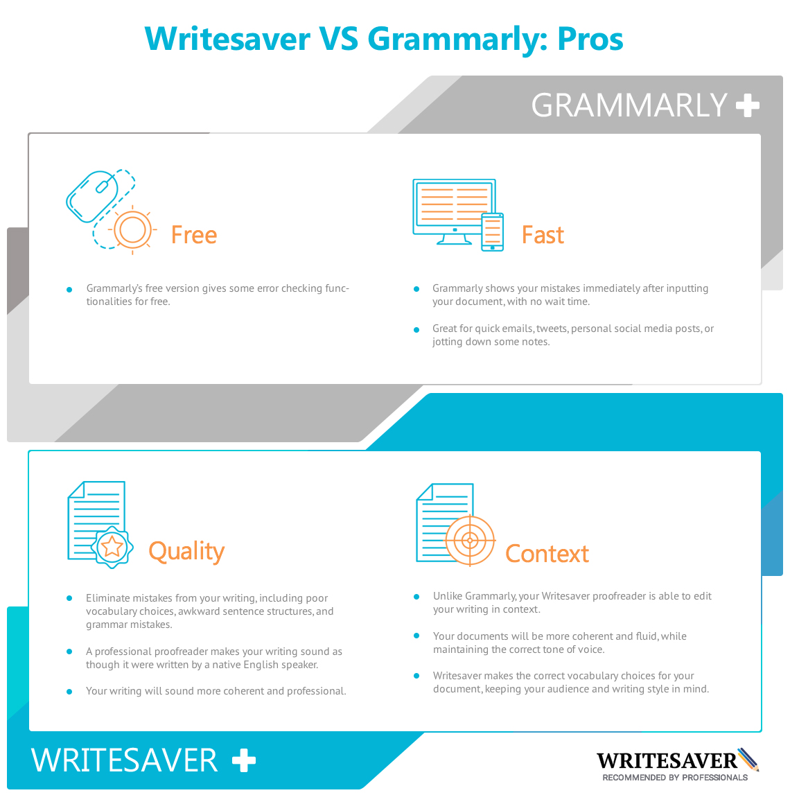 Now that we’ve gone into some of the pros and cons of Grammarly, let’s compare them with a proofreading service like Writesaver, which uses real, native English speakers to proofread your writing.